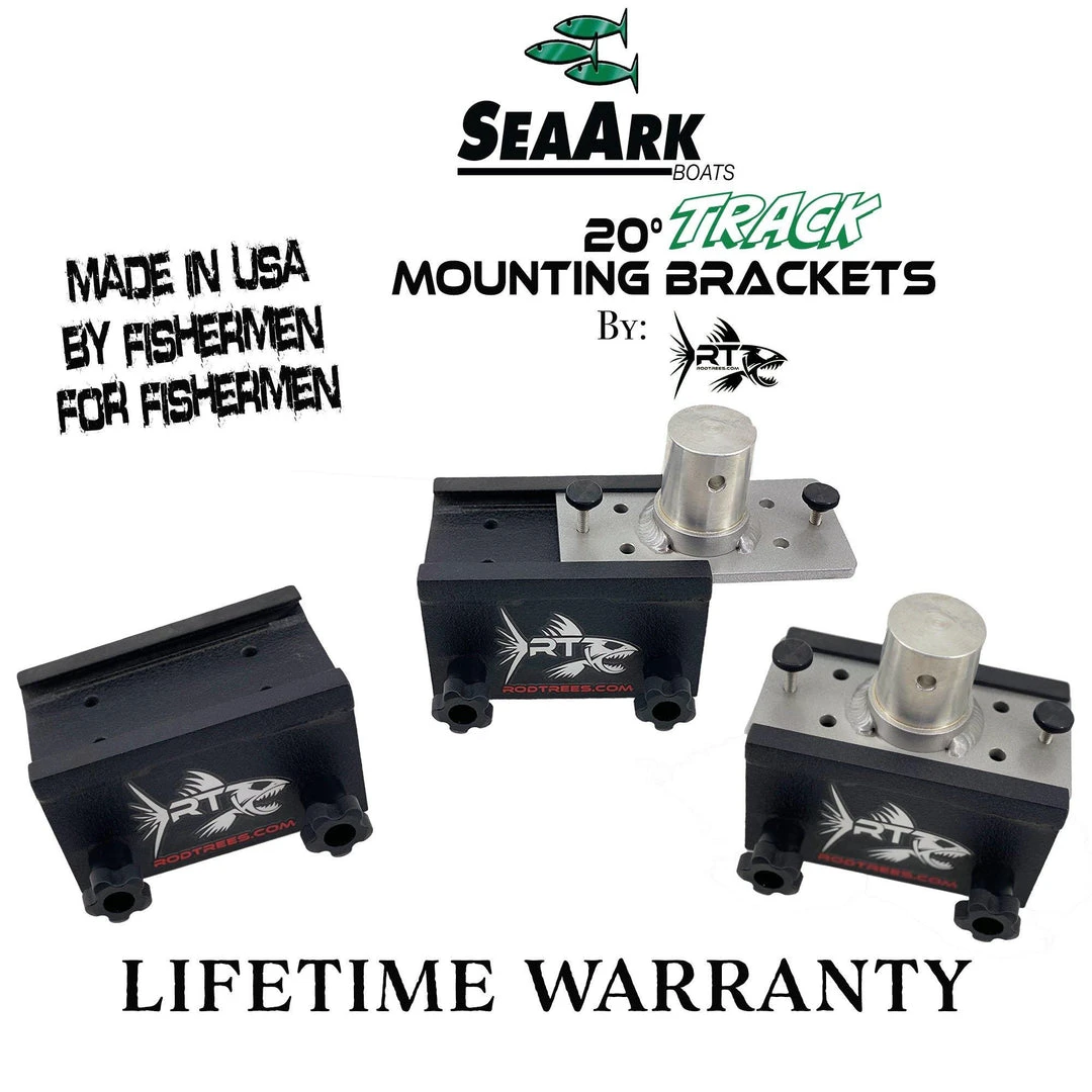 Our SeaArk 20⁰ Track Top Mounting Brackets are similar to our standard mounting brackets but have tracking welded directly to the top of the bracket. Easily slide your rod holder, rod tree, or other optional equipment into the top of the track. Built of a solid 3.5″ X 2.5″ X 6″ NON-bent, CNC two-piece custom design that is tig welded with 3/8″ 6061 aluminum, adjustable 3 mounting positions in height for optional clearance, stainless steel hardware included, and guaranteed true angle!